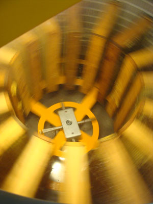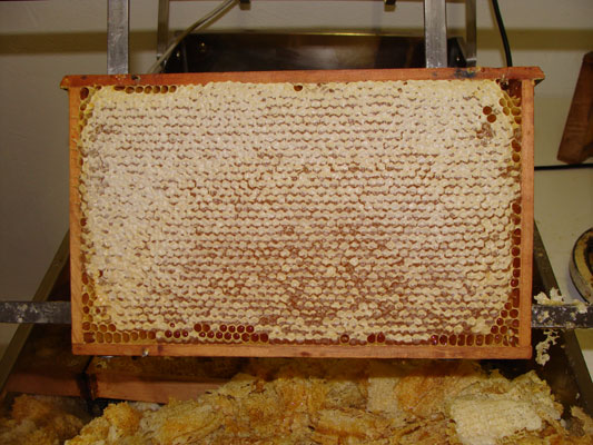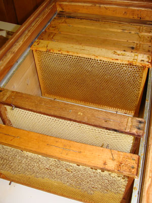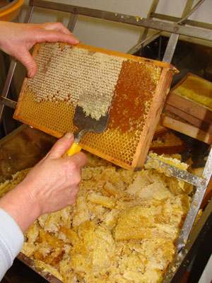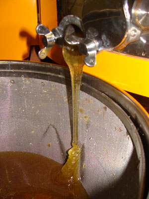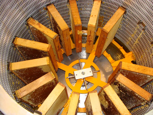 Normalerweise gewinnt der Imker den Honig, indem er dem Bienenstock die gefüllten Waben in Holzrahmen entnimmt und in einer Honigschleuder ausschleudert. |